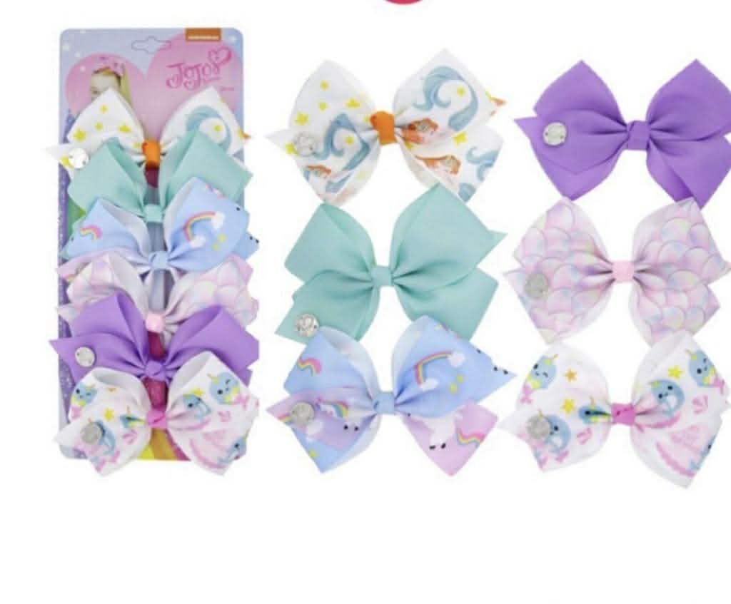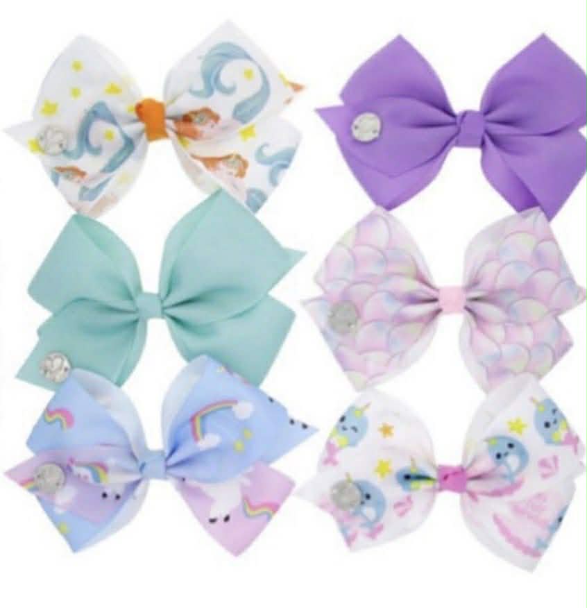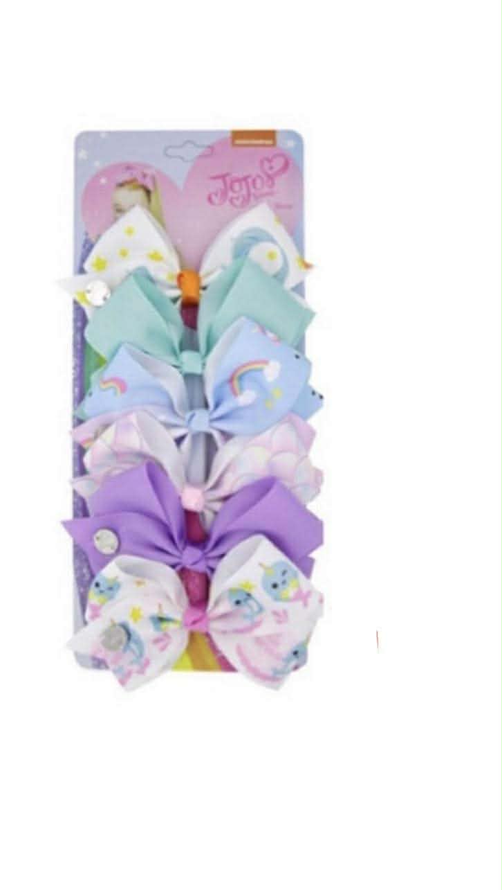 Set of 6 Jojo bows Size: 5 inch Color as show in picture Printed & sequin grosgrain ribbon material